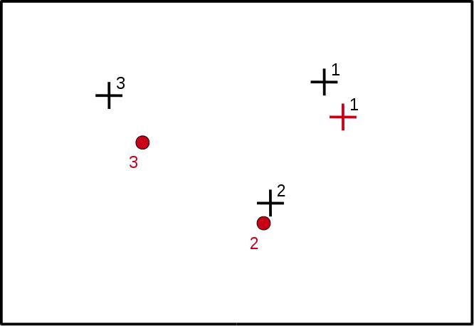 After that, images are acquired continuously and three different cases are considered. The first case is when 3 leds are detected. In this case each led is labeled according to the shortest distance from the previous labeling (see figure 1, below). The second case is when 2 leds are detected and one is missing due to occlusions or alignments. In this case, a first order approximation of the motion of leds is considered and they are labeled according to the shortest distance from their estimated position (see figure 2, below). The confidence variable decreases inversely proportiortional to the number of frames the sensor application is in this situation. The third case is when one led or no leds are detected at all. This case usually happens only when the helicopter gets completely out of the control space. The confidence variable is zero.